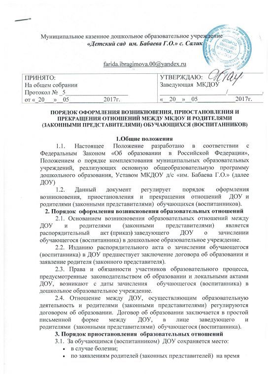 Порядок оформления возникновения, приостановления и прекращения отношений между образовательной организацией и обучающимися (воспитанниками) и (или) родителями (законными представителями) несовершеннолетних